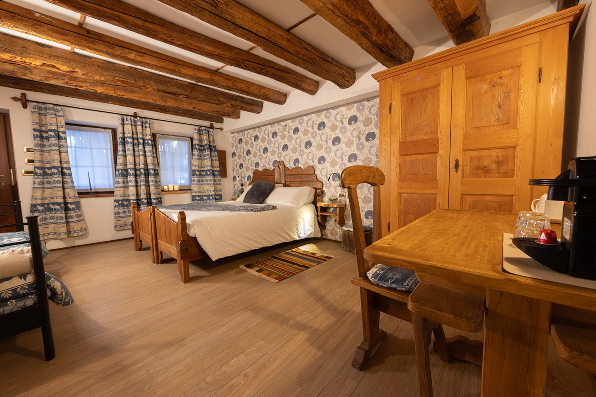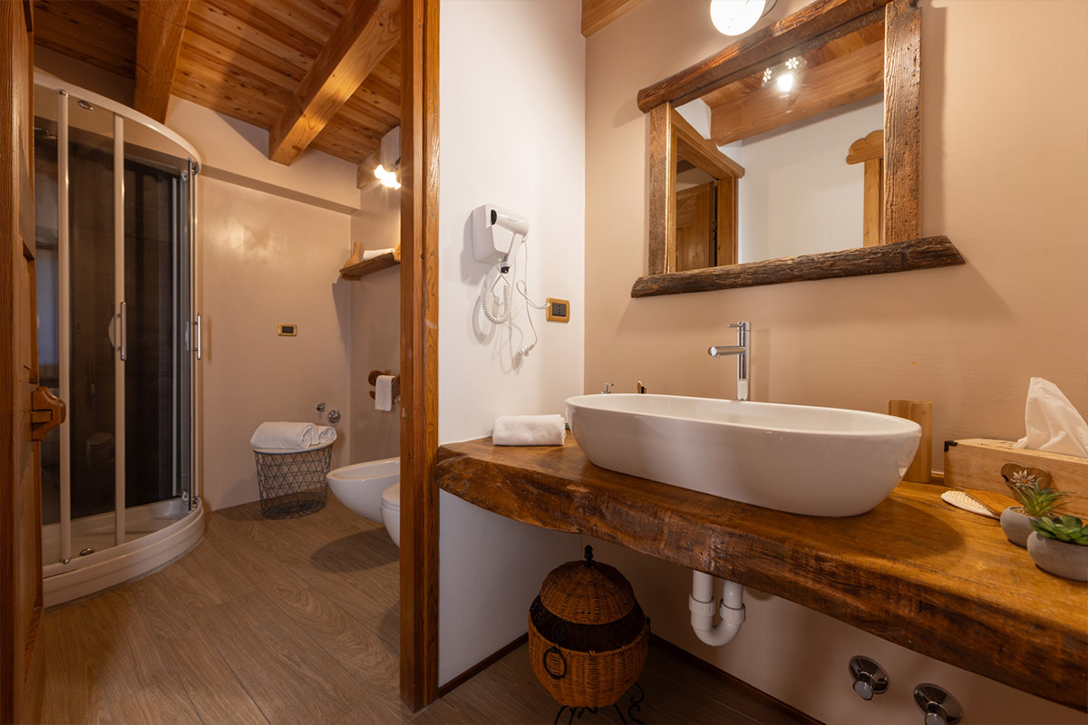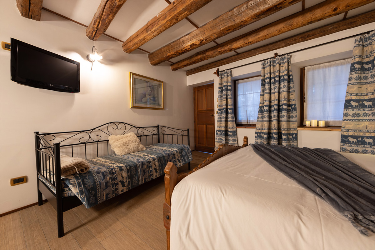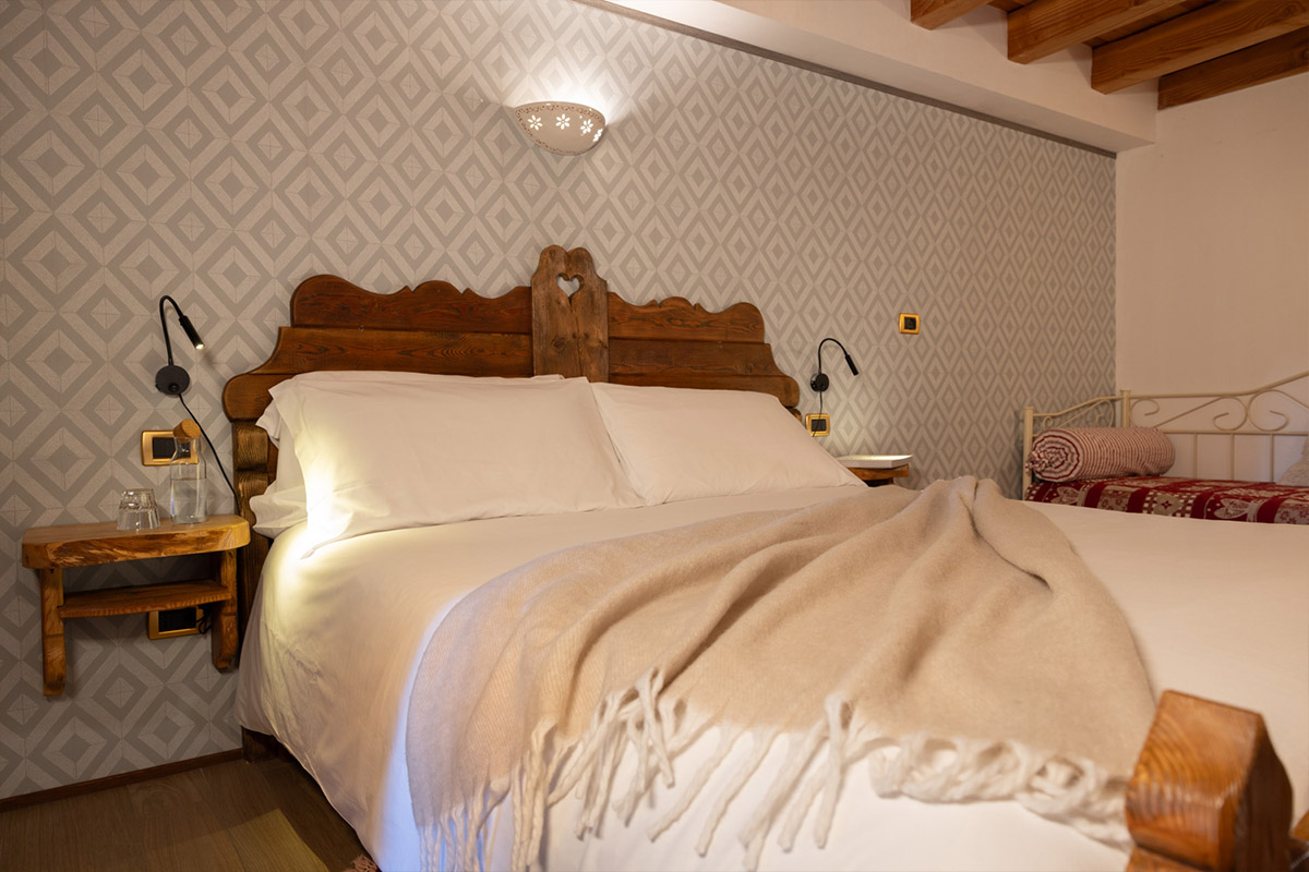 Being fitted out with a double bed, spacious wardrobe, desk and bathroom with a shower, all Châlet d’Aoste’s rooms are a secluded place, cut off from the city hustle and bustle – a quiet corner set aside for resting, lazing, planning excursions both in summer and winter.