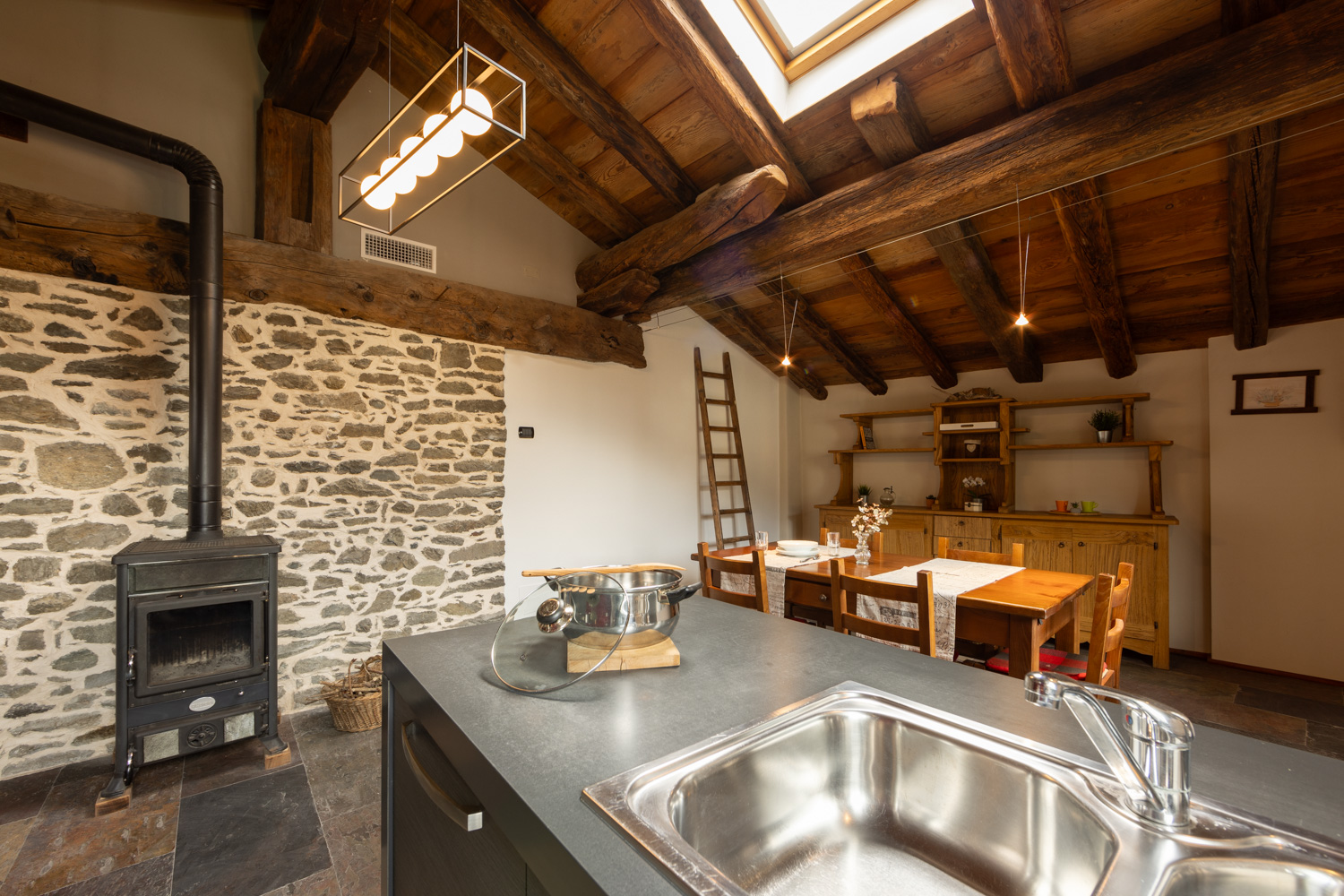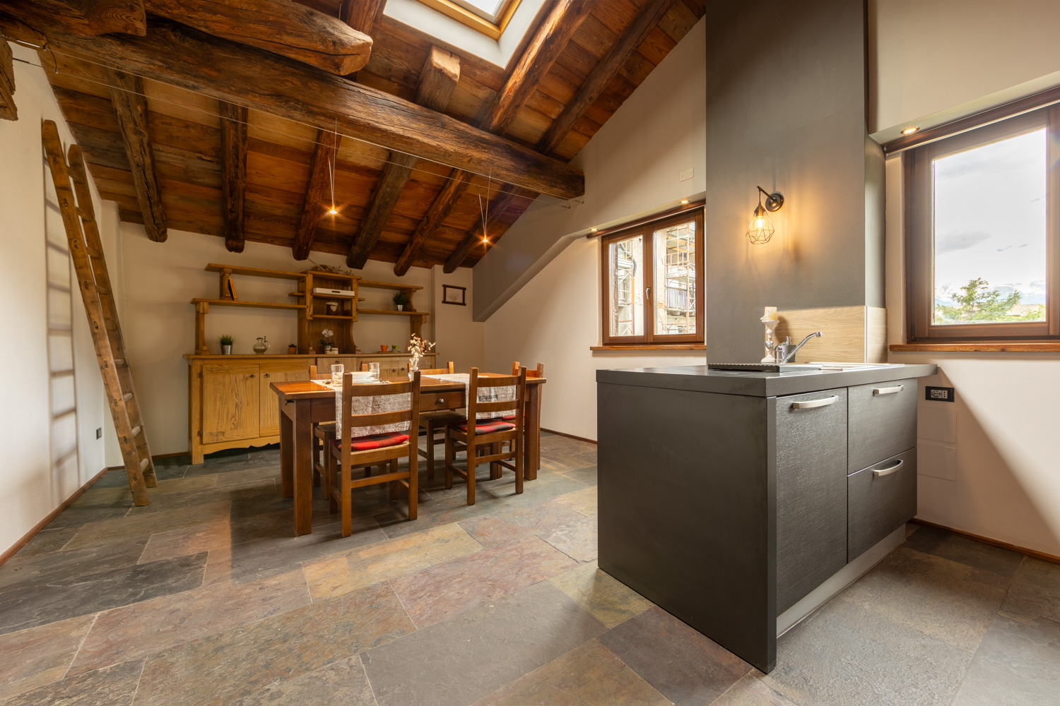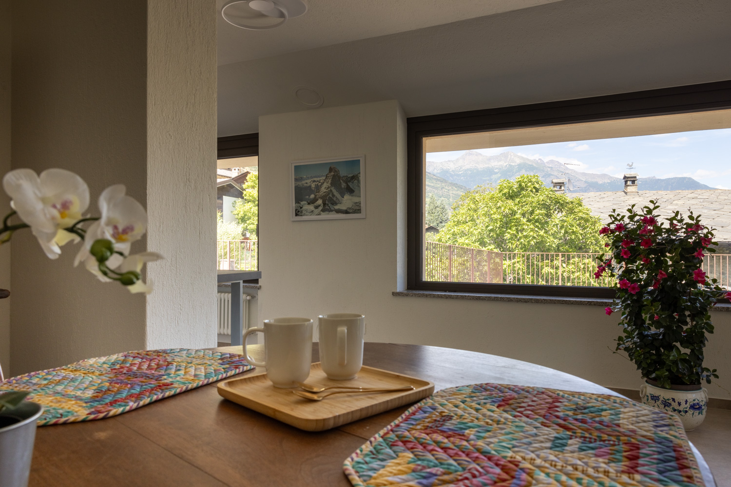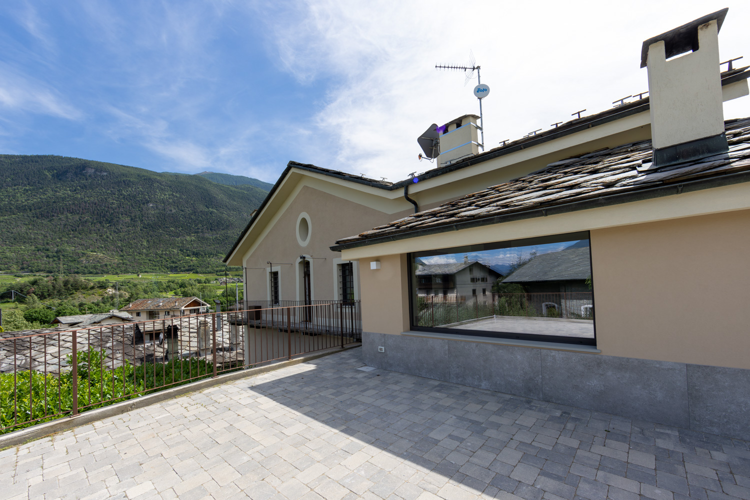 Qui, la combinazione di materiali naturali e arredi retrò crea una sinfonia di texture e storie che infonde eleganza e calore in ogni angolo della casa, trasformando ogni stanza in un capolavoro di eleganza senza tempo. Il pezzo forte della casa è certamente l’ampia terrazza panoramica, che offre una vista spettacolare sulla Valle d’Aosta ed è il luogo ideale per momenti di relax e condivisione all’aria aperta.